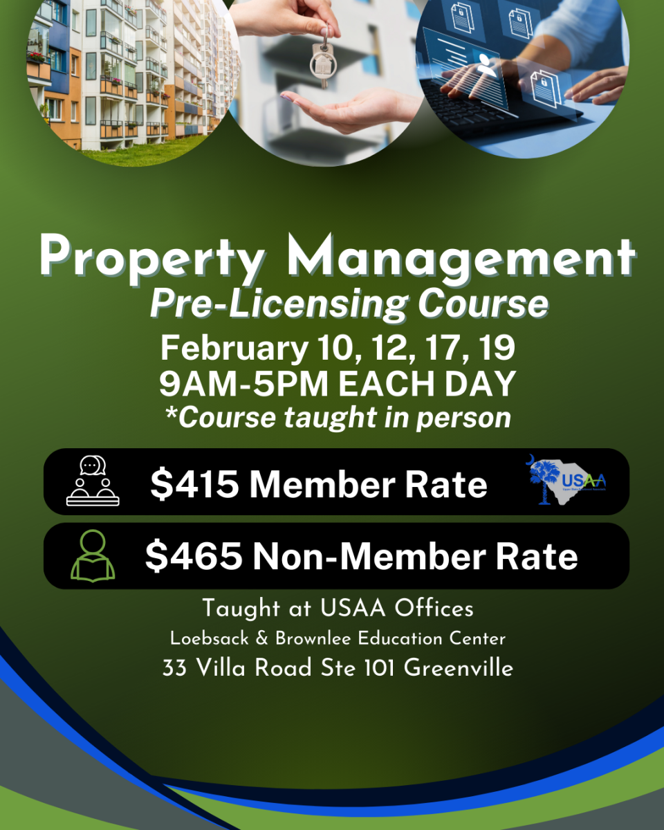 An instruction of real property management, including licensing laws, South Carolina Landlord and Tenant Act, Fair Housing, economics, marketing and leasing, lease negotiating, reporting, maintenance, cooperatives, and subsidized property. This 30-hour course is a pre-requisite to obtaining a South Carolina Property Management License for those desiring to manage income producing properties for other property owners. USAA Property Management instructors are licensed through the South Carolina Real Estate Commission to teach this course. The Property Management Pre-Licensing course will be offered four times in 2022: January, April, July and October.